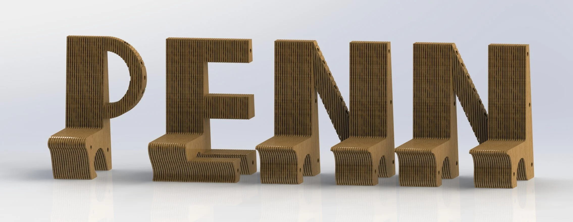Concept: A set of chairs that spell out Penn and have different functions. Two are for lounging and two are collaborative spaces with a table. Students sitting intertwined with the word Penn is the perfect image of the creative and hard working spirit found in the IPD program. This provides a powerful first impression for anybody entering the building.